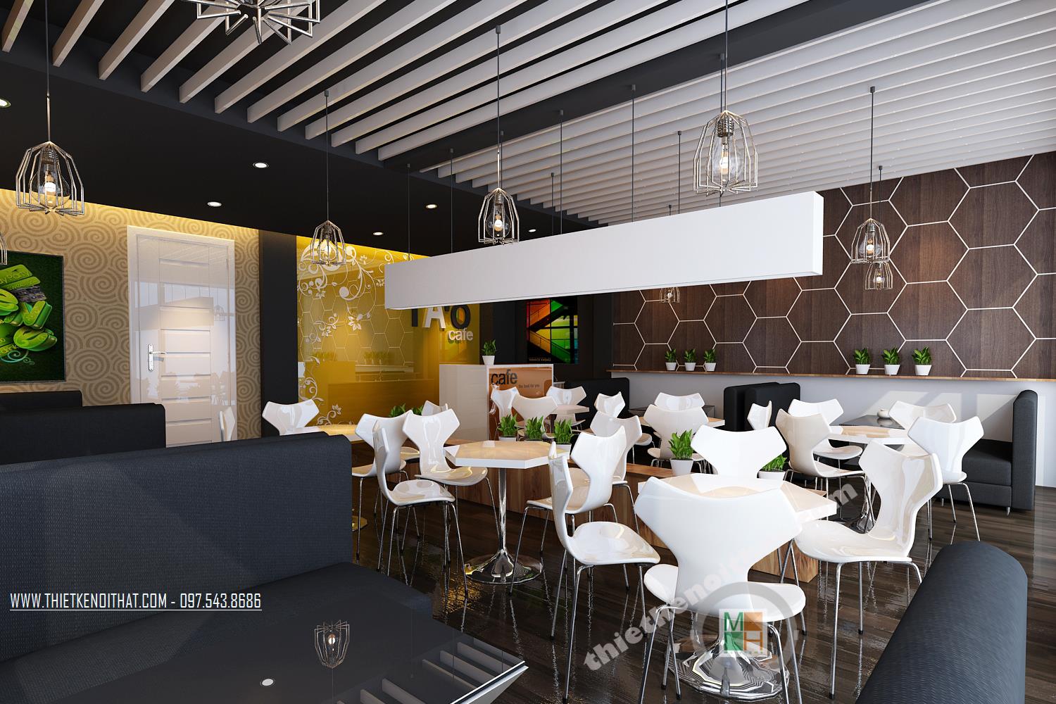 Bên cạnh đó, với việc nắm bắt rõ thị yếu của thực khách kết hợp với mong muốn và ý tưởng của khách hàng, kiến trúc sư đã mở rộng tối đa view hướng ra bên ngoài. Không gian thiết kế xanh với các chậu cây nhỏ, xinh đặt gọn gàng tạo thành vách ngăn khéo léo giữa lối đi cũng là điểm nhấn vừa đảm bảo yếu tố thẩm mỹ vừa mang lại cảm giác thư giãn và nhẹ nhàng cho thực khách.