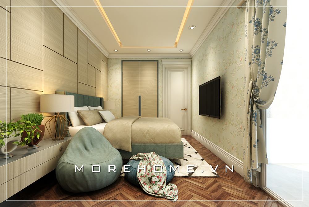 Thiết kế nội thất giường ngủ tân cổ điển ấn tượng, các họa tiết hoa văn được chạm khắc đơn giản không quá cầu kỳ, màu sắc nhẹ nhàng tinh tế mang lại sự sang trọng cũng như đẳng cấp của chủ nhân