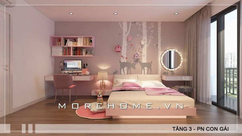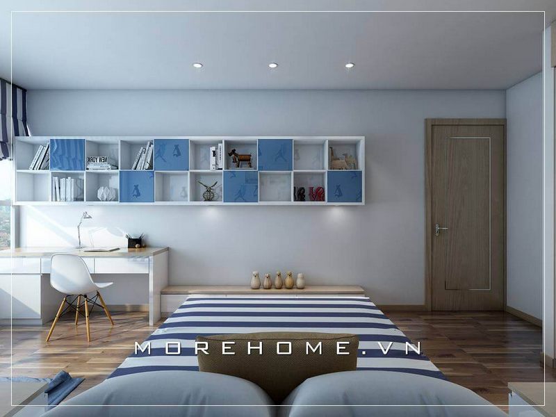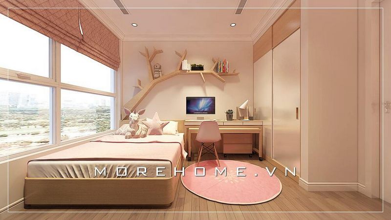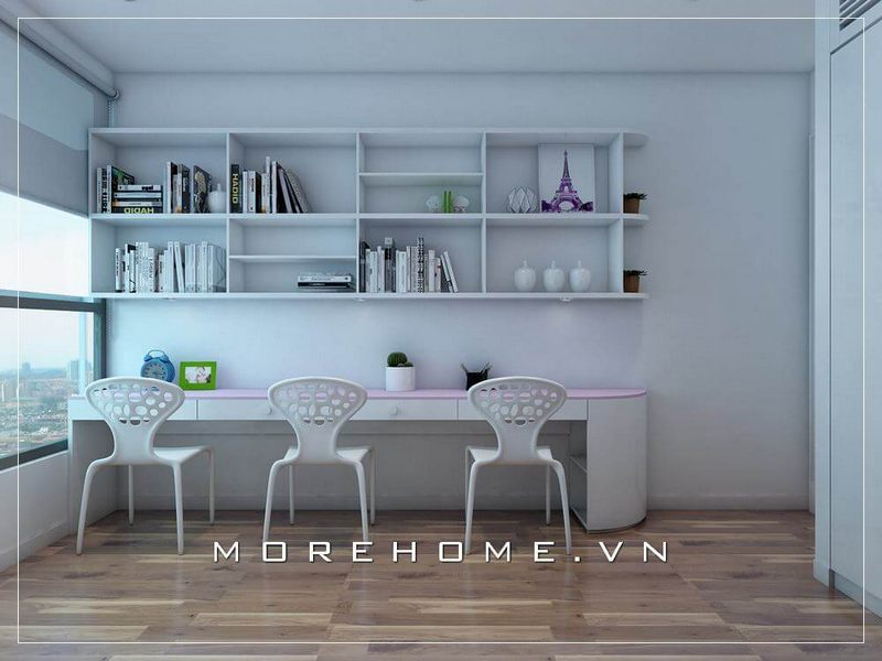 Bàn học của con được thiết kế hiện đại đặt ngay cạnh cửa sổ, giá sách treo ngay trên bàn học, giúp trí tưởng tượng bay cao, giúp bé có tư duy tốt hơn.