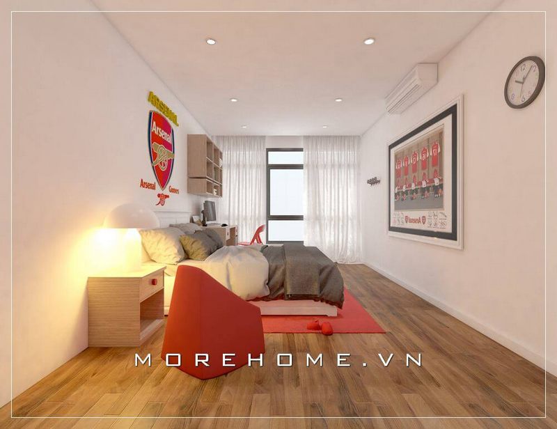 Mẫu phòng ngủ tông màu trắng trẻ trung, với bàn học kết hợp cùng giá sách giúp tiết kiệm diện tích sử dụng, cửa sổ lớn với rèm che màu xám tạo điểm nhấn và làm cho căn phòng trở nên rộng rãi và thoáng mát hơn