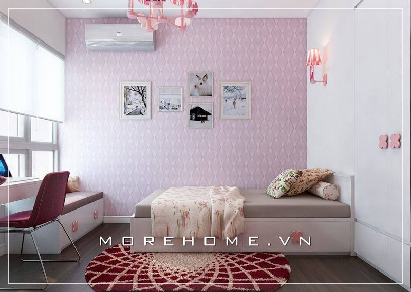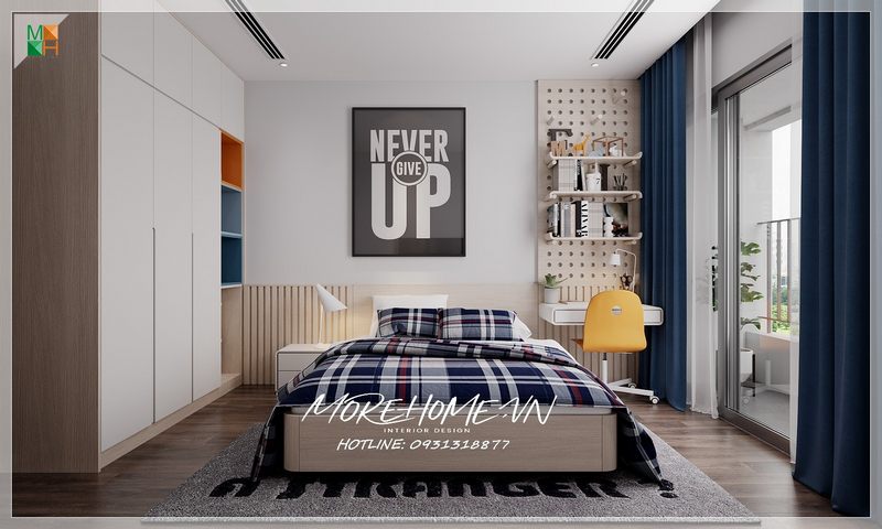 Bàn học gỗ công nghiệp được bố trí cạnh cửa sổ giúp không gian học tập luôn được thông thoáng.
