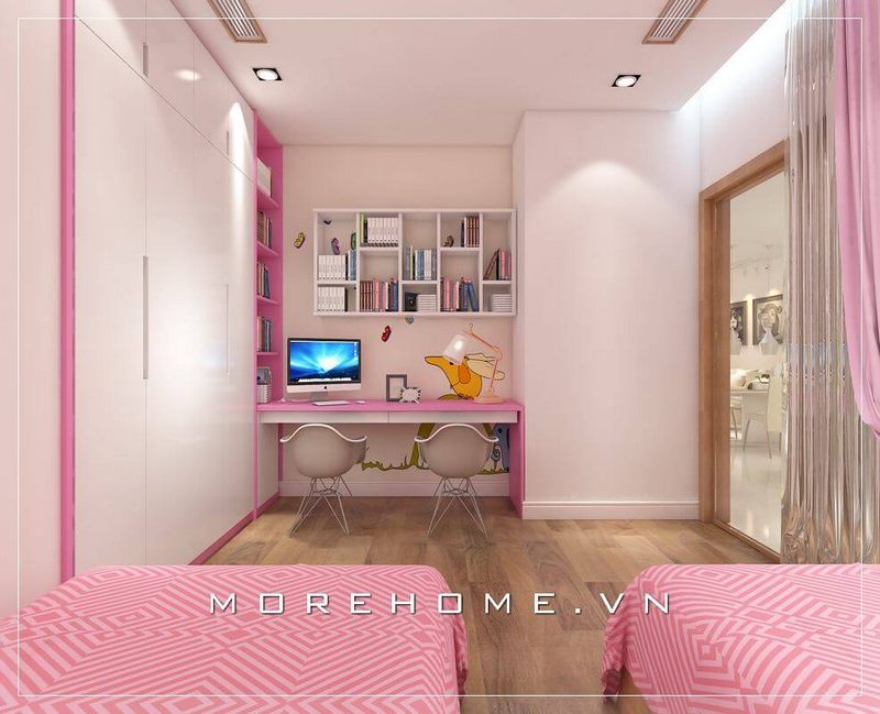 Mẫu bàn học liền kệ sách, tủ để đồ gỗ công nghiệp hiện đại cho phòng ngủ bé gái dễ thương