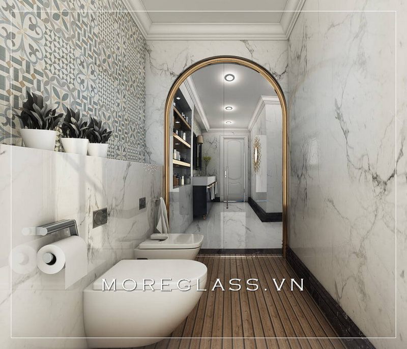 Mẫu thiết kế nhà vệ sinh và nhà tắm biệt thư cao cấp có tường ốp đá tự nhiên màu trắng vân mây mang đến sự sang trọng và đẳng cấp.