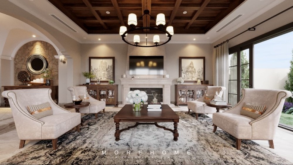 Phòng khách được thiết kế theo phong cách địa trung hải bố cục hợp lí khoa học, để đón tiếp khách tới chơi với sự chu đáo và thể hiện tính cách gu thẩm mỹ riêng của gia chủ.