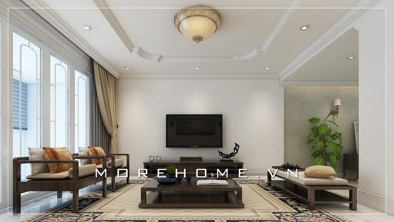 Nội thất phòng khách của chung cư tân cổ điển sử dụng hai tone màu chủ đạo là trắng và vàng nâu nhẹ giúp tạo nên sự hài hòa và ấn tượng tuyệt vời cho khu vực tiếp khách của gia chủ.