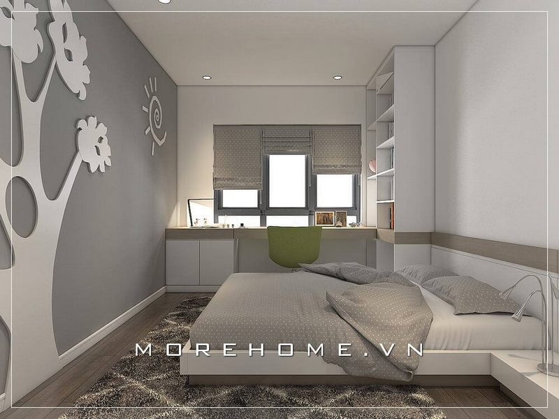 . Phòng ngủ của bé trai được trang bị nội thất hiện đại, màu trắng làm nổi bật, sàn gỗ màu nâu giúp tạo nên một không gian ấm áp và nhẹ nhàng hơn.